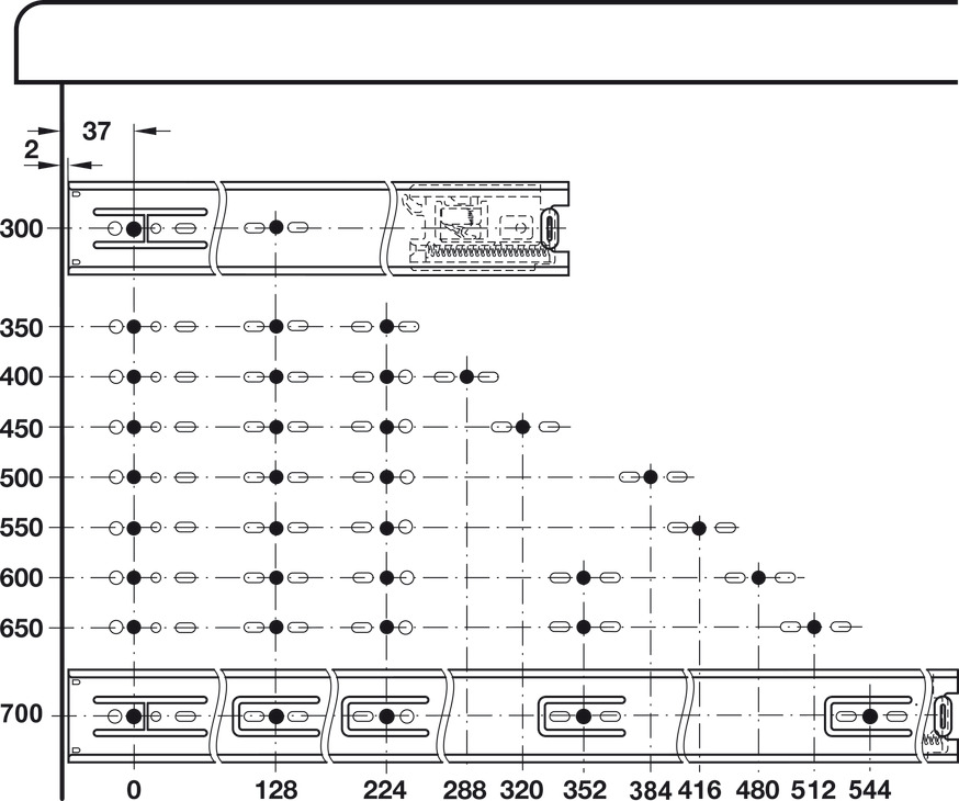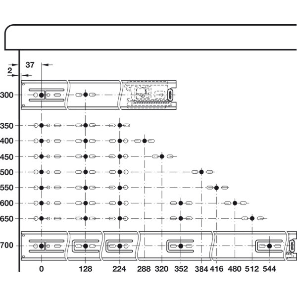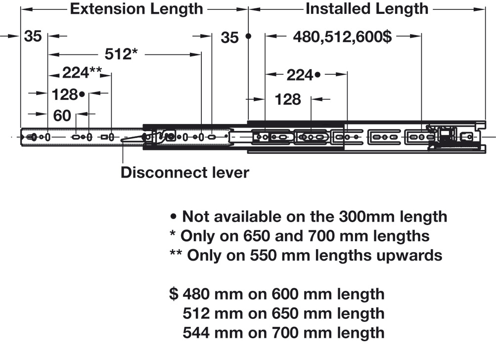 Telescopic, side mounted, Installed length 400 mm, load capacity 44 kg